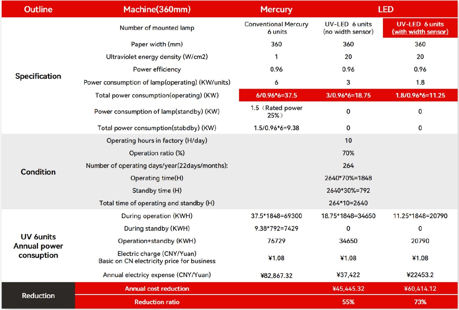 Por ejemplo, con un ancho de impresión de 360 mm, una configuración de impresión de seis colores y un programa operativo promedio de 10 horas por día durante 22 días al mes, el consumo de energía varía notablemente entre las lámparas de mercurio tradicionales y los sistemas LED UV.